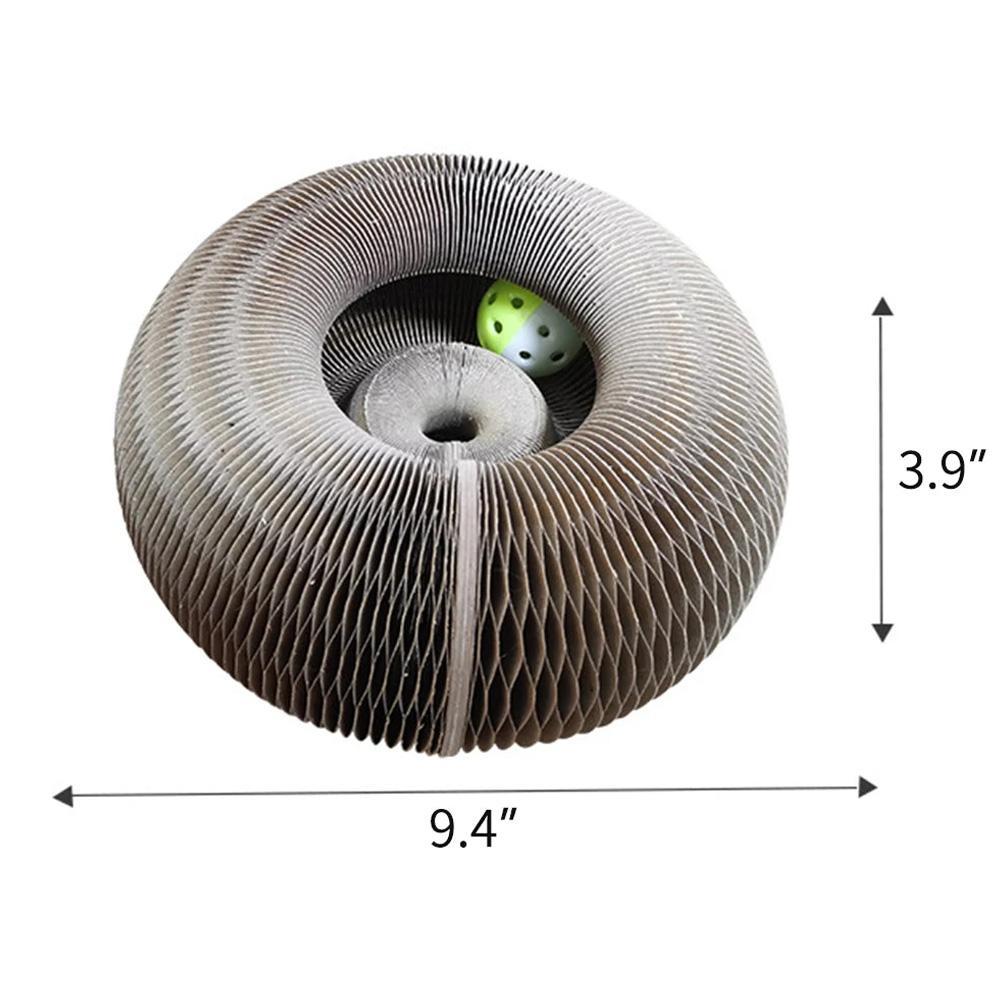 The Catcordion is a scratchboard-like cat toy with a unique twist! It's a flexible and extendable accordion-like structure with ends that magnetically connect to form a donut!